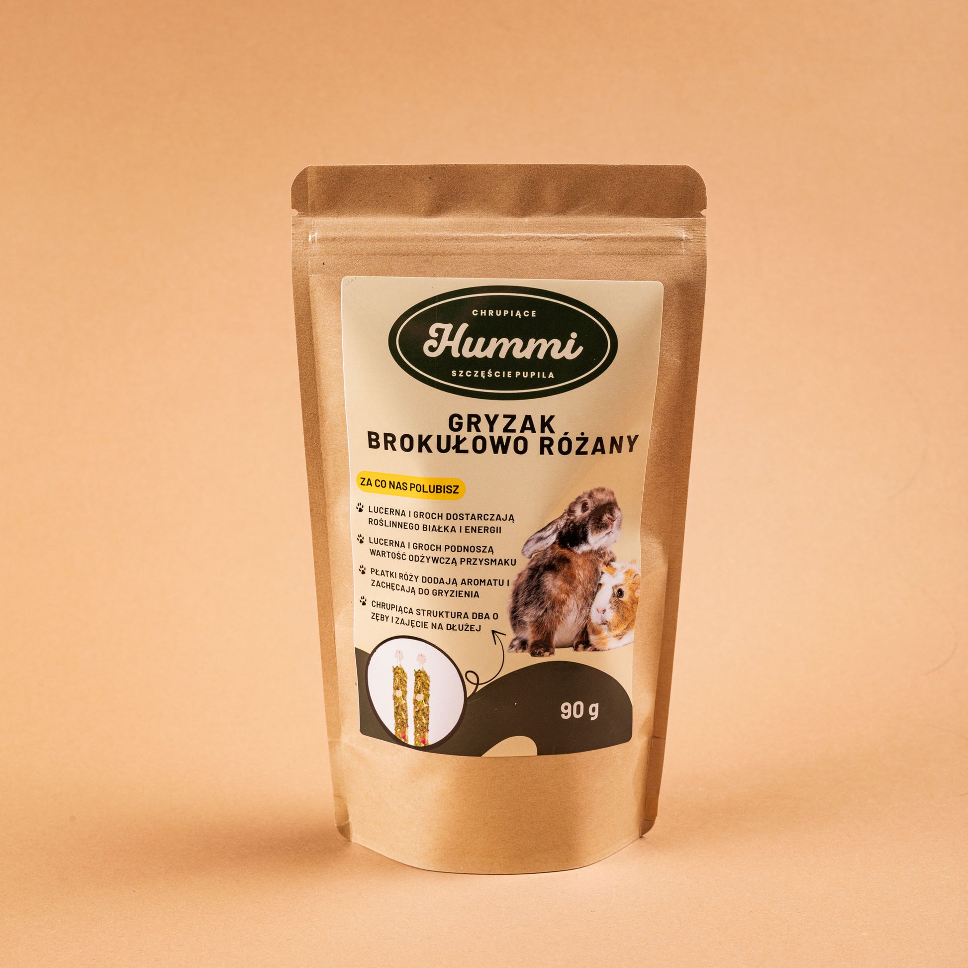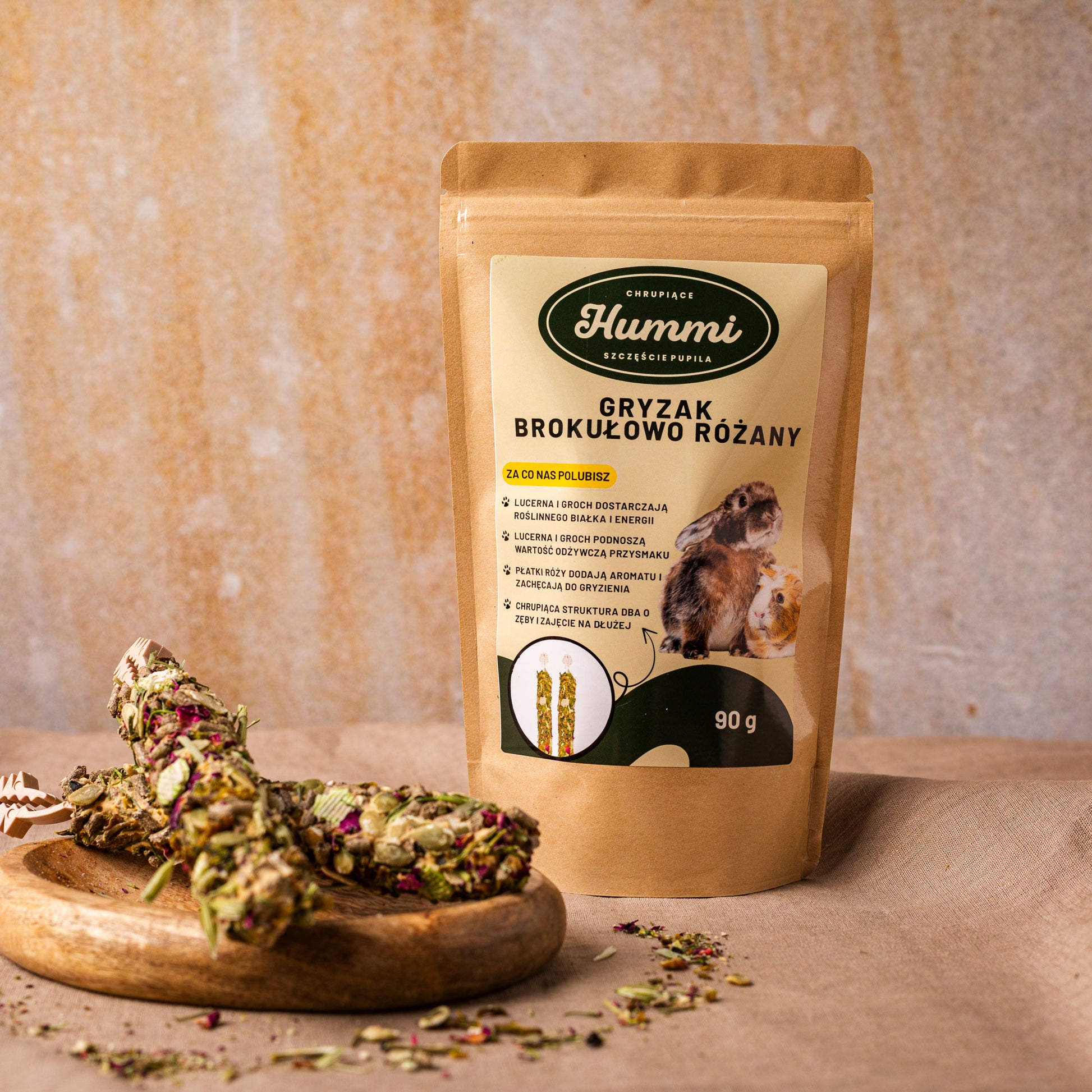 Gryzak warzywno-ziołowy HUMMI to w 100% bezbożowy przysmak przeznaczony dla wszystkich gryzoni oraz królików. Starannie dobrana kompozycja brokułów, płatków róży i pestek dyni tworzy naturalny, aromatyczny gryzak, który łączy wysoką smakowitość z funkcjonalnym zastosowaniem w codziennej diecie.