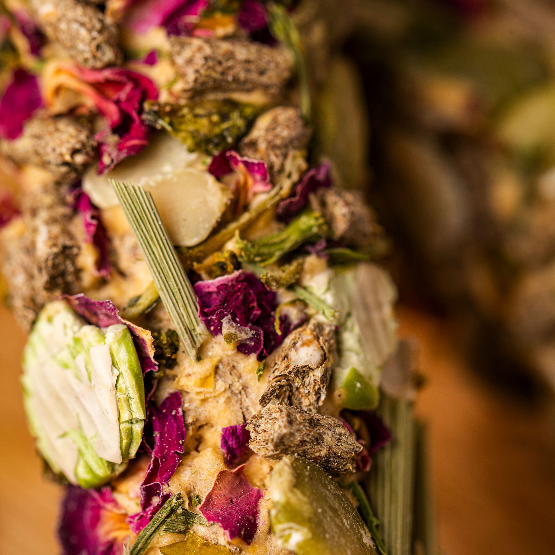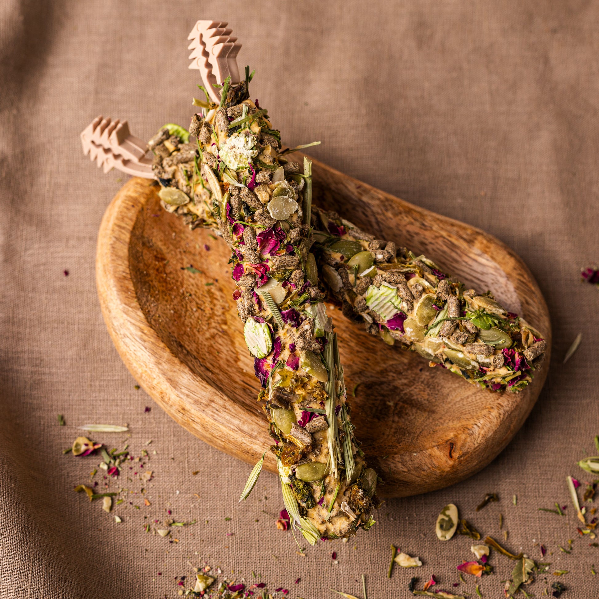 Brokuły stanowią cenne źródło witamin i składników mineralnych, wspierając ogólną kondycję organizmu oraz prawidłowe funkcjonowanie układu pokarmowego. Ich naturalny smak sprawia, że gryzak jest chętnie wybierany nawet przez bardziej wybredne zwierzęta. Płatki róży wzbogacają przysmak o naturalną witaminę C i mikroelementy, co jest szczególnie istotne w diecie świnek morskich. Dodatkowo nadają gryzakowi delikatny aromat i atrakcyjny wygląd.