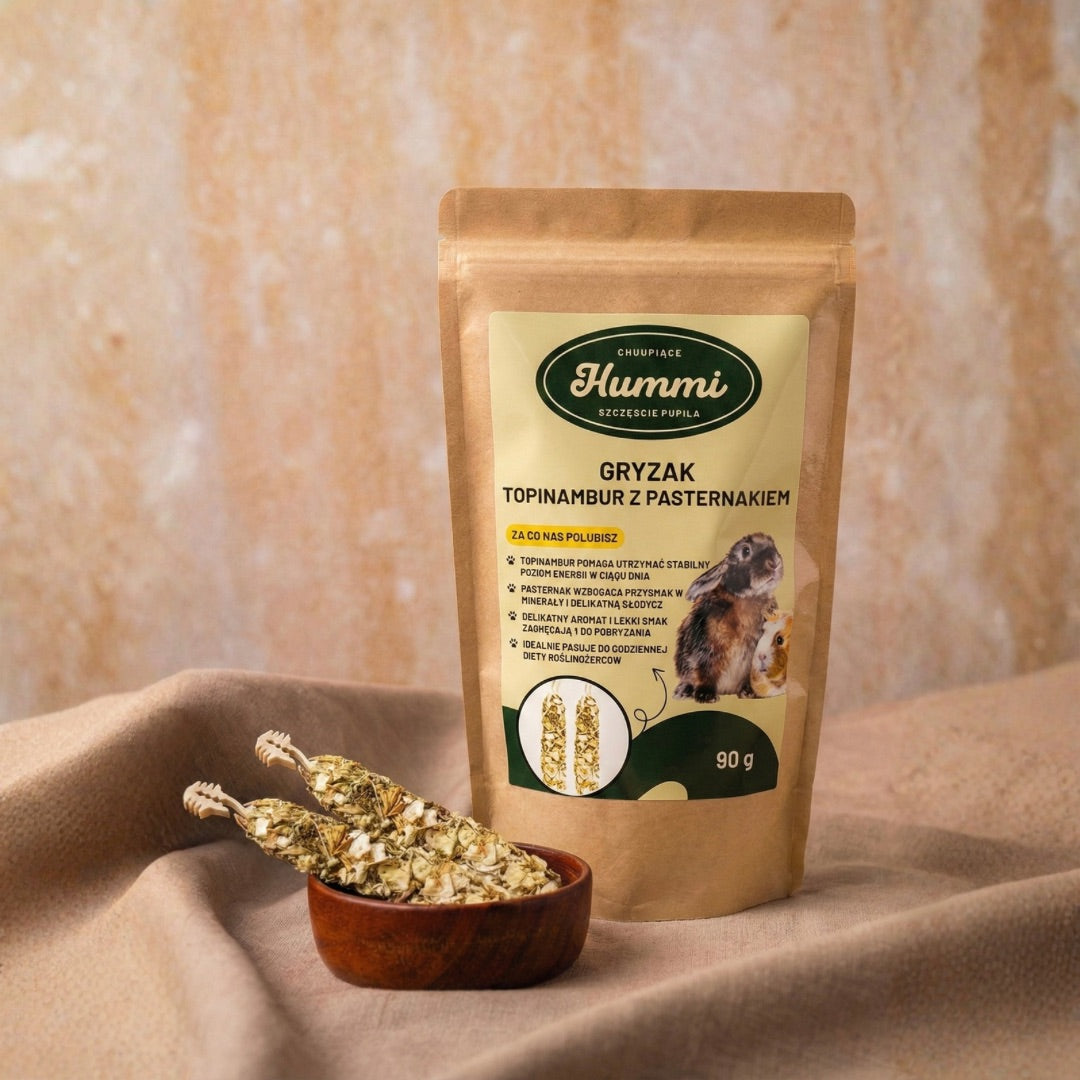Gryzak topinambur z pasternakiem HUMMI to naturalna, roślinna przekąska stworzona z myślą o zdrowym urozmaiceniu diety królików i małych gryzoni. W jego składzie znajduje się aż 30,5% suszonego topinamburu oraz 11,5% pasternaku, które nadają gryzakowi naturalną słodycz i wysoką smakowitość. Oba składniki są bogate w włókno oraz naturalne związki roślinne wspierające układ pokarmowy. Topinambur dostarcza inuliny o działaniu prebiotycznym, a pasternak jest źródłem witamin i lekkostrawnych węglowodanów.