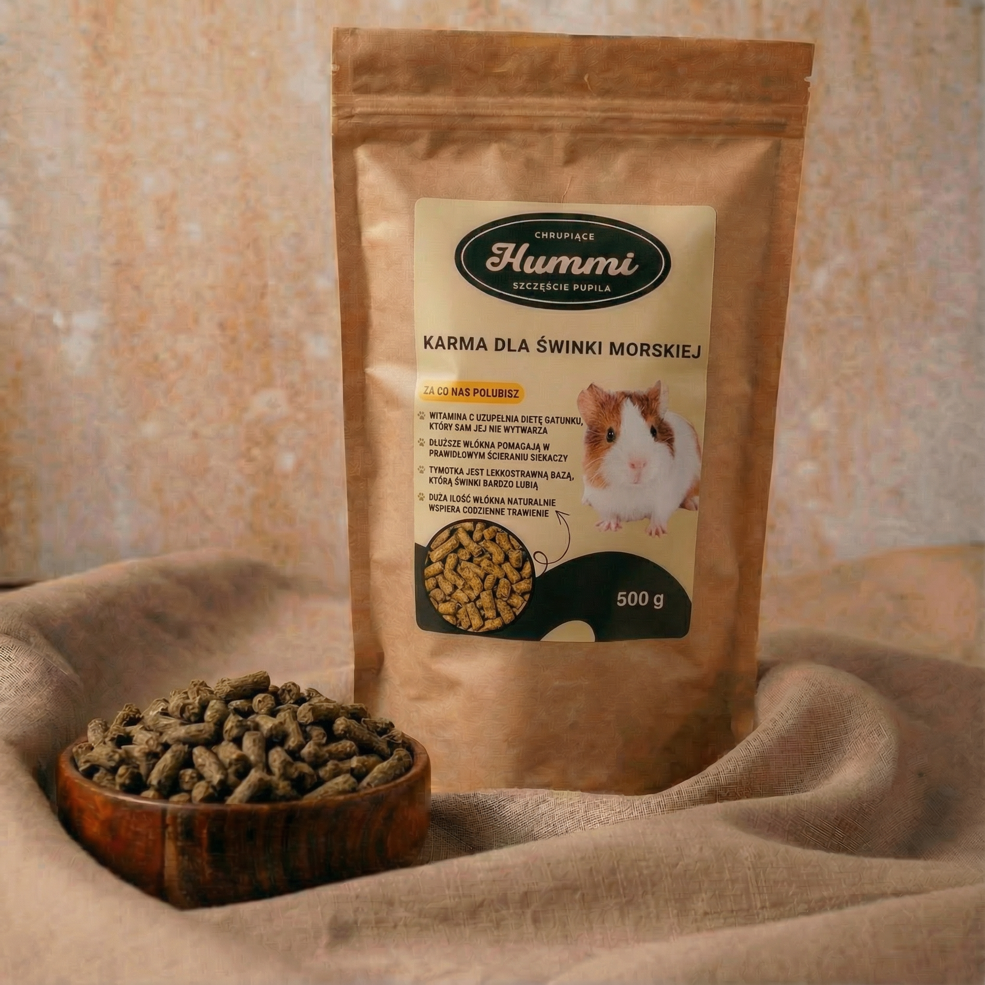 Karma dla świnki morskiej HUMMI to pełnoporcjowa, wysokowłóknista mieszanka, opracowana specjalnie pod potrzeby żywieniowe świnek morskich. Jej bazą jest tymotka – jedno z najbezpieczniejszych i najcenniejszych źródeł włókna dla tego gatunku. To ona wspiera prawidłową pracę układu pokarmowego, stabilizuje perystaltykę jelit i pomaga utrzymać właściwą masę ciała. Dodatek suszonych roślin pszenicy oraz lucerny dostarcza naturalnych składników roślinnych wpływających na żywotność i ogólną kondycję zwierzęcia.