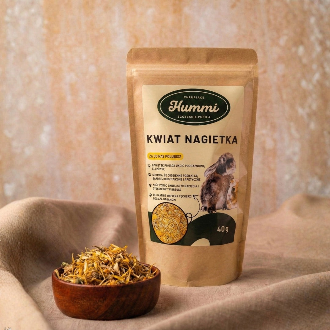 Kwiat nagietka HUMMI to naturalny, suszony dodatek roślinny ceniony za swoje właściwości wspierające zdrowie układu pokarmowego i odpornościowego. Nagietek jest od lat stosowany jako roślina łagodząca, dzięki wysokiej zawartości naturalnych przeciwutleniaczy, flawonoidów oraz związków o działaniu przeciwzapalnym. W diecie małych zwierząt może wspierać prawidłowe trawienie, pomagać w utrzymaniu równowagi jelitowej oraz korzystnie wpływać na ogólną kondycję organizmu.