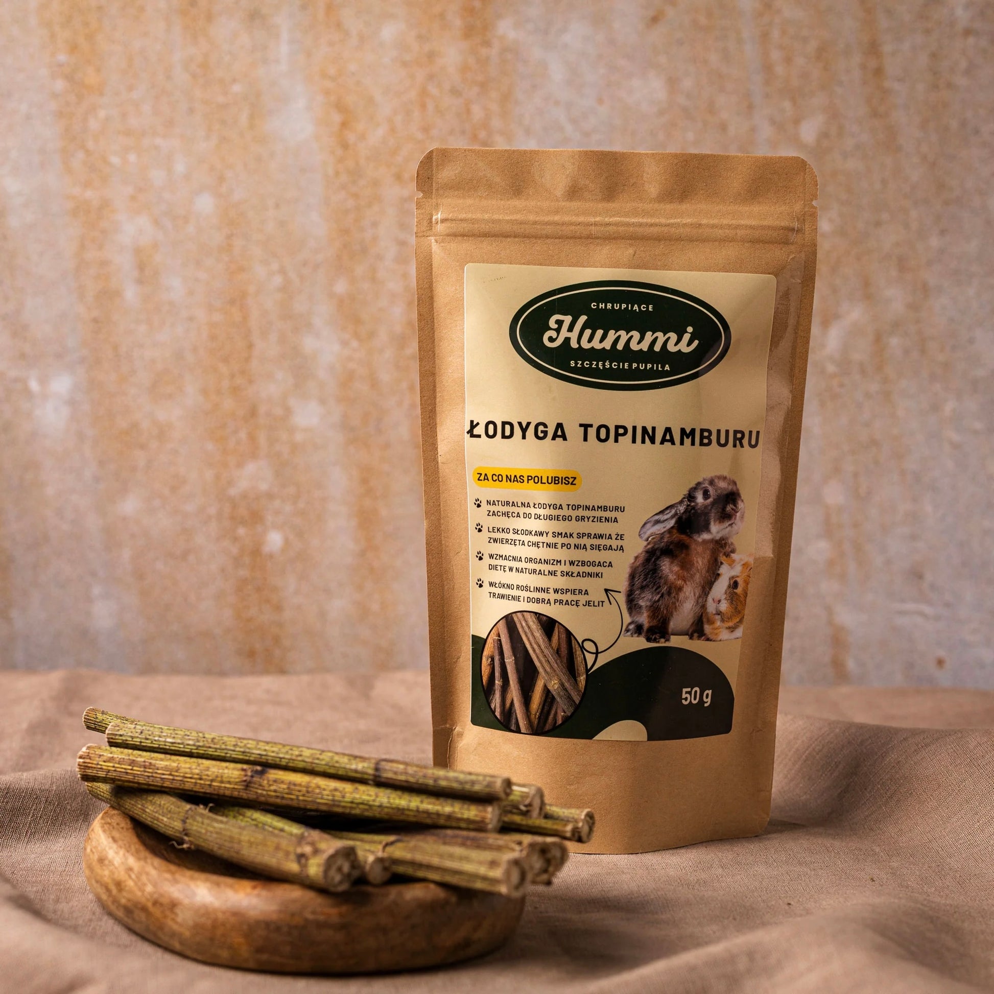Łodyga topinamburu HUMMI to naturalny, suszony gryzak roślinny przeznaczony dla królików i małych gryzoni. Produkt powstaje wyłącznie z łodyg topinamburu, bez dodatków, konserwantów i obróbki chemicznej. Zachowuje naturalną strukturę i aromat rośliny, dzięki czemu jest chętnie pobierany przez zwierzęta.