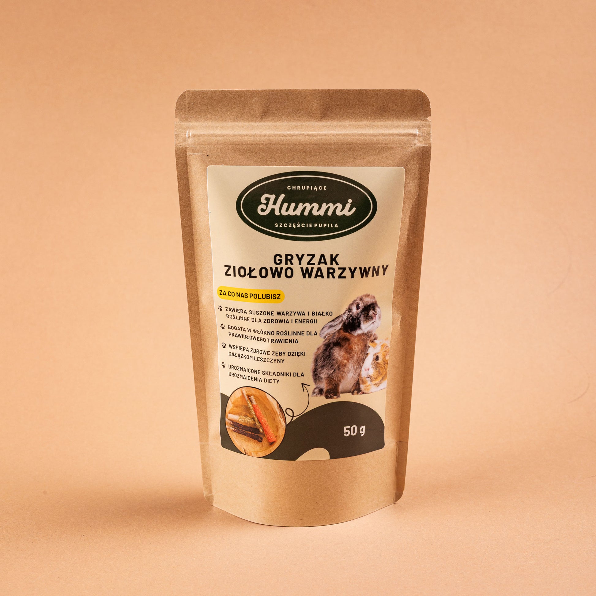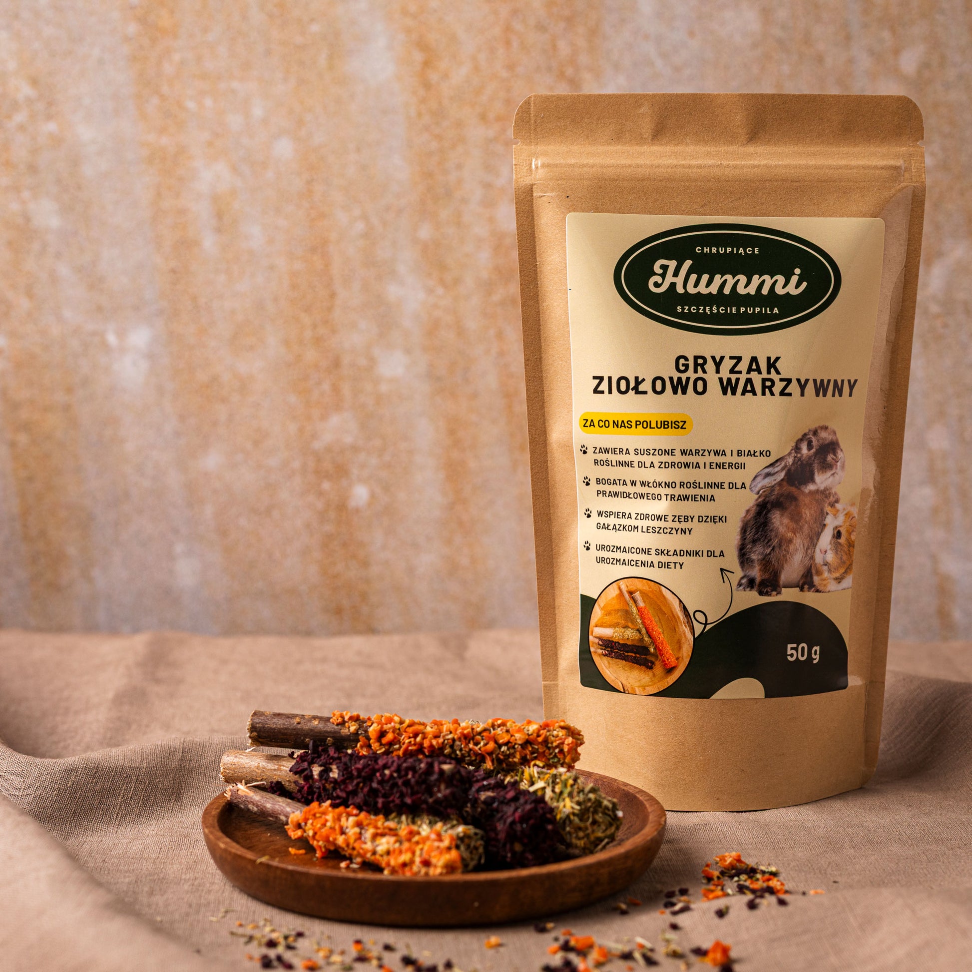 Gryzak ziołowo-warzywny HUMMI to naturalny przysmak stworzony na bazie suszonych pędów leszczyny oraz suszonej pietruszki, połączonych niewielkim dodatkiem skrobi roślinnej. Prosty, czysty skład zapewnia wysoką smakowitość i bezpieczeństwo podawania nawet najbardziej wrażliwym małym zwierzętom. Produkt nie zawiera barwników, konserwantów ani dodatku cukru.Suszone pędy leszczyny stanowią naturalny materiał do gryzienia, który wspiera prawidłowe ścieranie zębów i pomaga zapobiegać ich przerastaniu. To jedno z najlepszych, w pełni bezpiecznych włóknistych źródeł do naturalnej pielęgnacji uzębienia u gryzoni i królików. Pietruszka suszona dostarcza witamin oraz składników mineralnych, a jednocześnie wzbogaca aromat i zachęca zwierzę do żucia i eksploracji. Twarda struktura gryzaka zapewnia długotrwałe zajęcie, wspiera naturalne zachowania żerowe i redukuje nudę w klatce. Produkt jest odpowiedni dla chomików, królików, świnek morskich, myszy, szczurów oraz dla szynszyli jako przekąska okazjonalna.