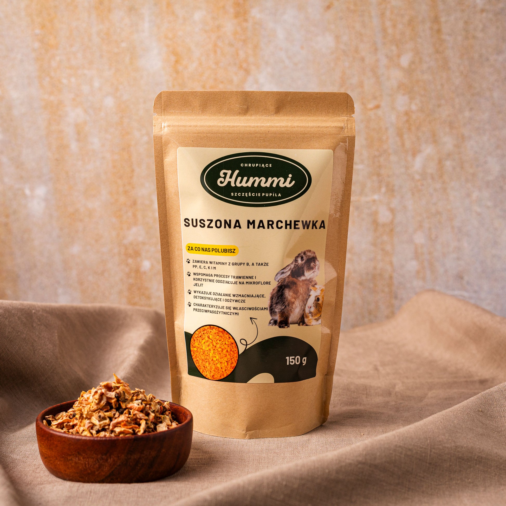 Marchewka to jeden z ulubionych przysmaków gryzoni i królików. Nic dziwnego – jest bogata w beta-karoten, który wspiera zdrowie wzroku i skóry, a także wzmacnia odporność. Zawiera również witaminę K, wapń i błonnik, które wspierają mocne kości oraz prawidłowe trawienie. Suszona marchewka jest chrupiąca, pachnąca i stanowi doskonałe uzupełnienie codziennej diety. Dzięki swojej strukturze marchewka dodatkowo wspiera naturalne ścieranie zębów u gryzoni. Podawaj jako przekąskę w ciągu dnia lub jako dodatek do karmy podstawowej.